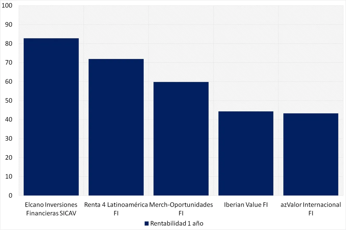 A pesar de empezar con mal pie, 2016 ha sido un año bastante bueno para la industria de gestión de activos en España. Una gran cantidad de fondos de autor han obtenido elevadas rentabilidades y los gestores españoles brilllan dentro de la industria. Estos resultados aún se reflejan a primeros de este año, Elcano Sicav ha sido el producto de inversión más rentable durante 2016 con una rentabilidad del 48,3%. A día de hoy alcanza una rentabilidad del 82,75% a un año, seguido por el Renta 4 Latinoamérica (71,9%) y por dos de los productos estrella de Merchbanc, Merch-Oportunidades FI (59,77%) y Merchfondo (53,19%). A continuación se muestra una tabla con los fondos españoles más rentables a un año (he añadido la Sicav de Elcano al listado). El gráfico muestra los 5 productos más rentables escogiendo uno por categoría de entre los primeros de la tabla.