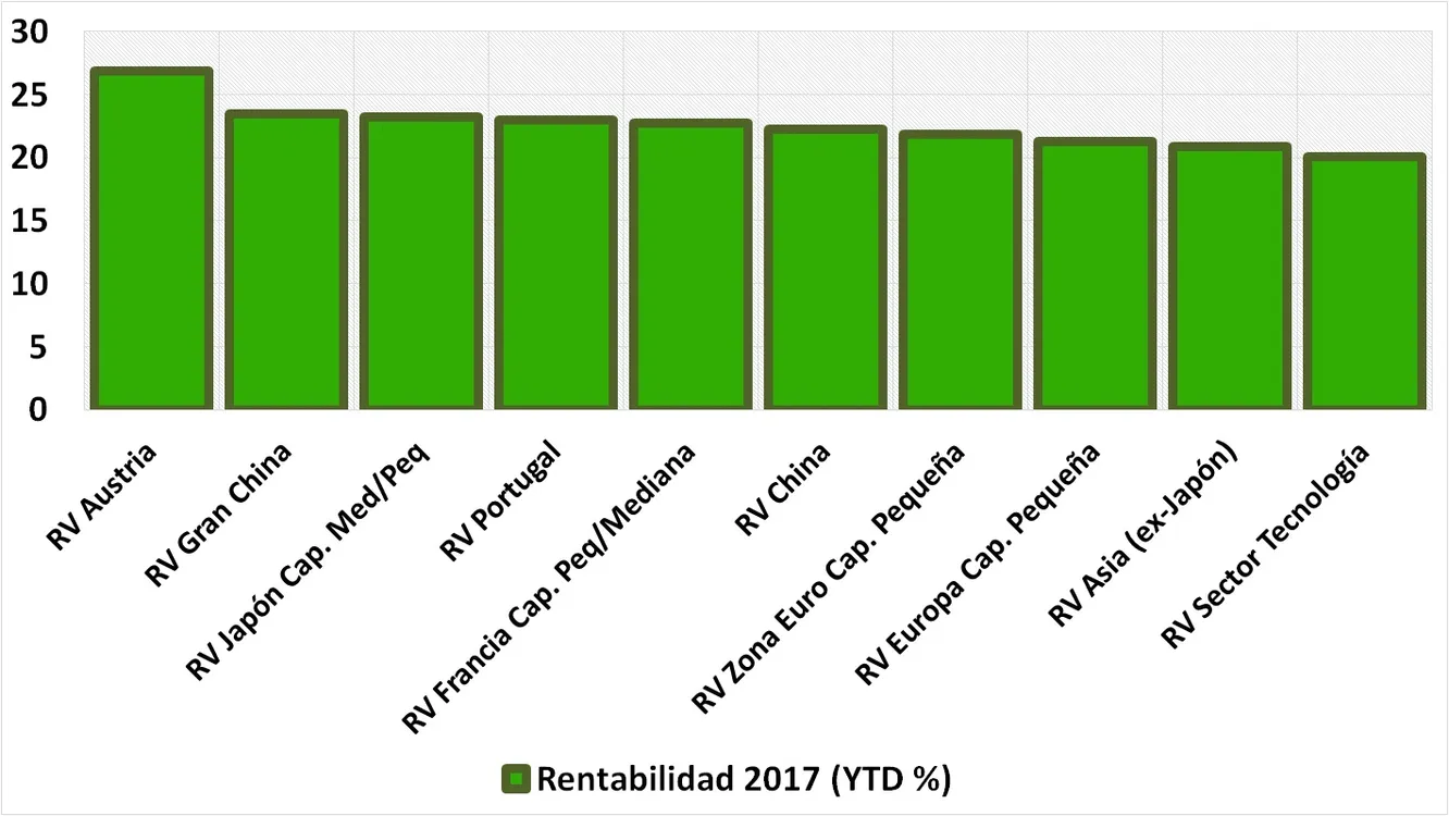 A punto de terminar el año así es como quedan las categorías de fondos de inversión más y menos rentables desde enero. Liderando las subidas (por países) destacan RV Austria, Gran China, Japón y Portugal con rentabilidades superiores al 20% tal y como podemos observar. A continuación se muestra el top 10 más rentable en 2017: