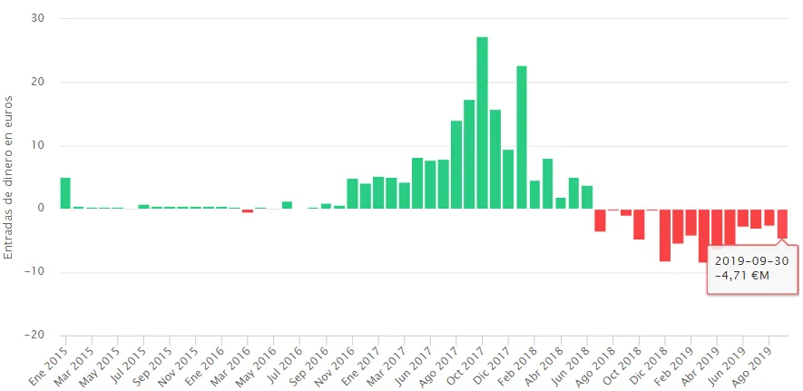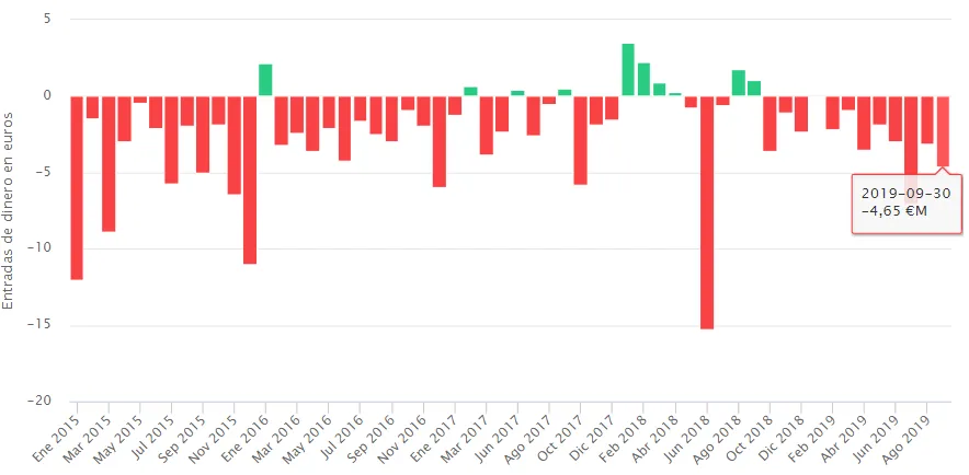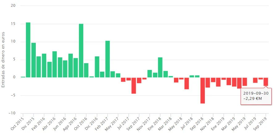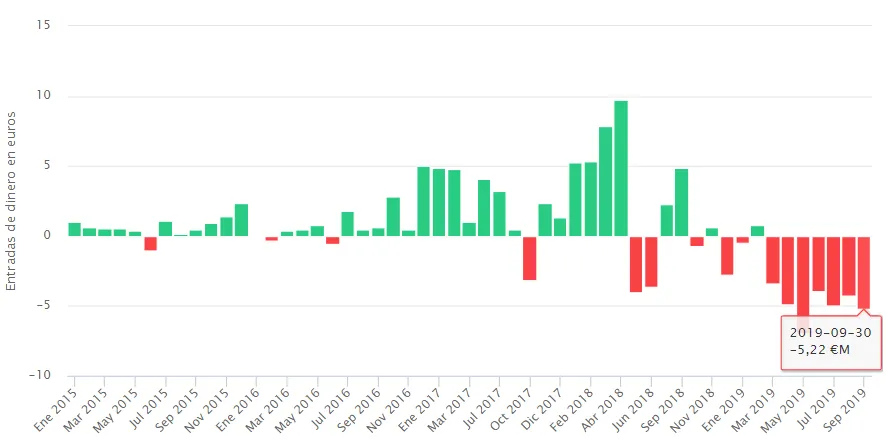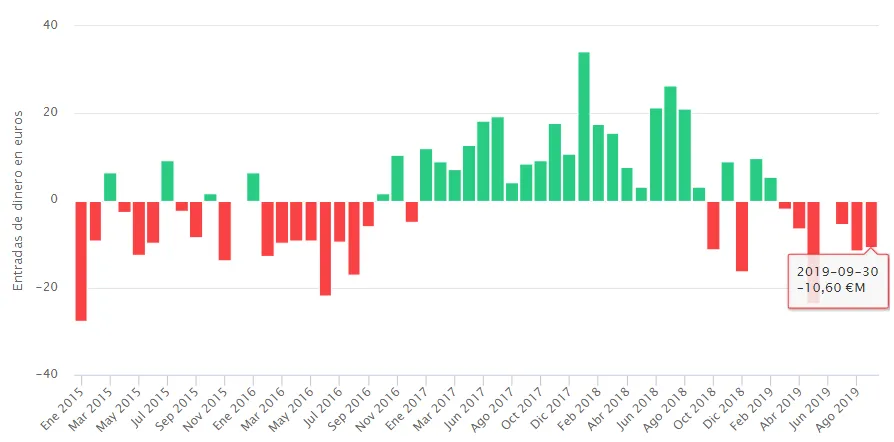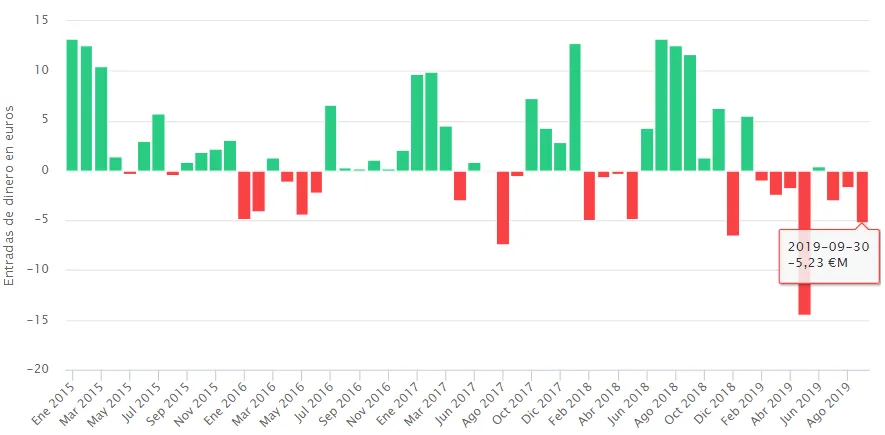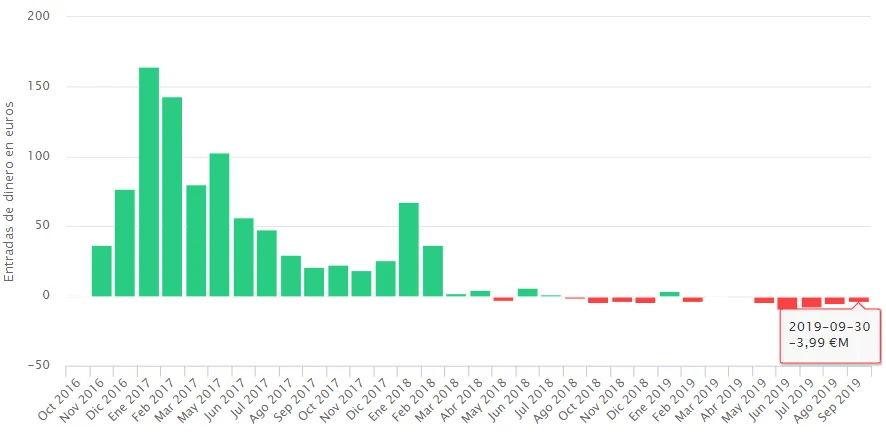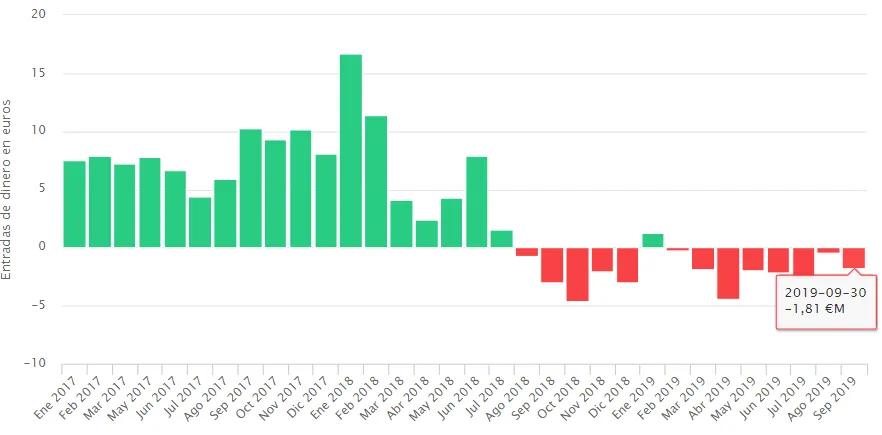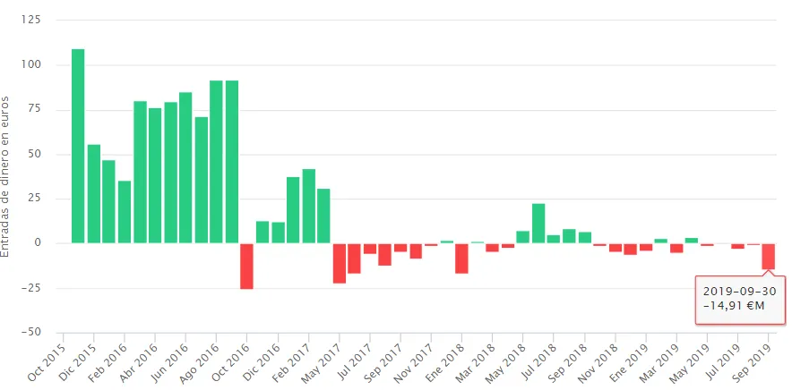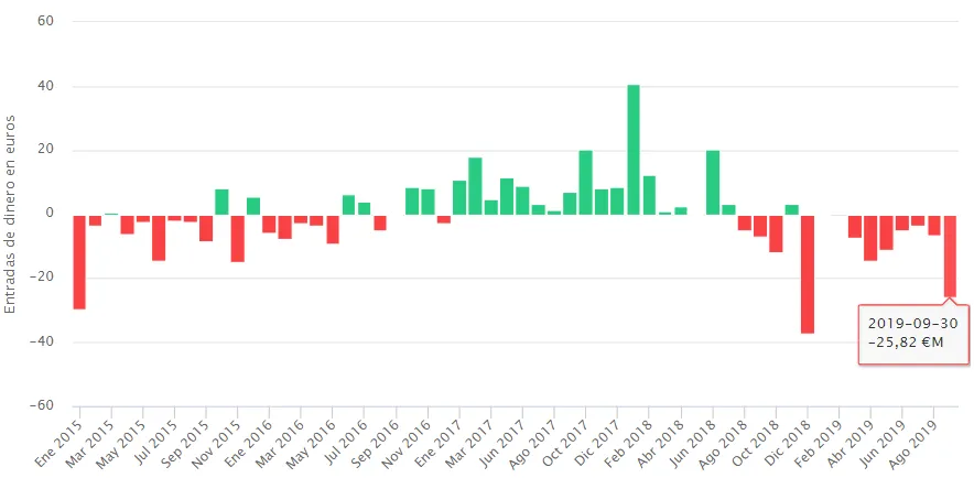 Tras una racha plana en lo que se refiere a flujos de dinero, septiembre se convierte en el mes con mayores salidas desde enero de 2018, en concreto por una cuantía que roza los 15 millones de euros.