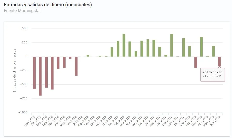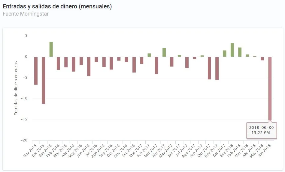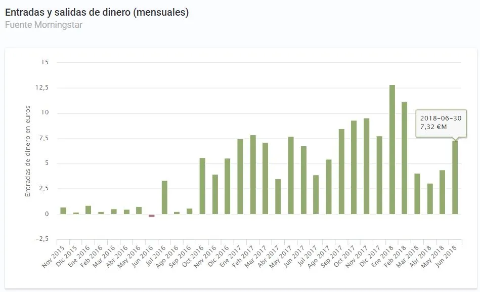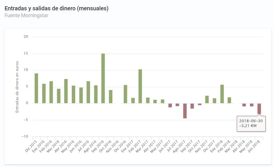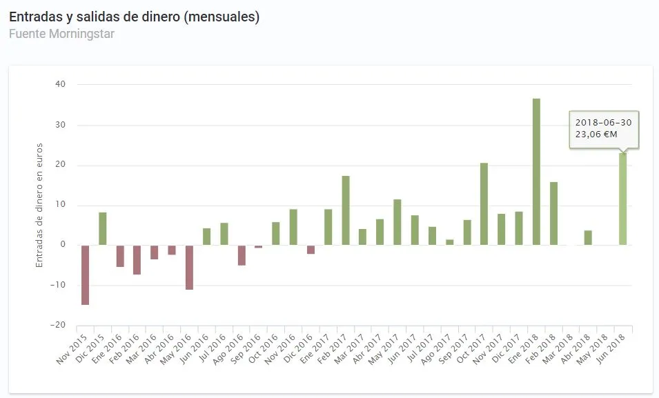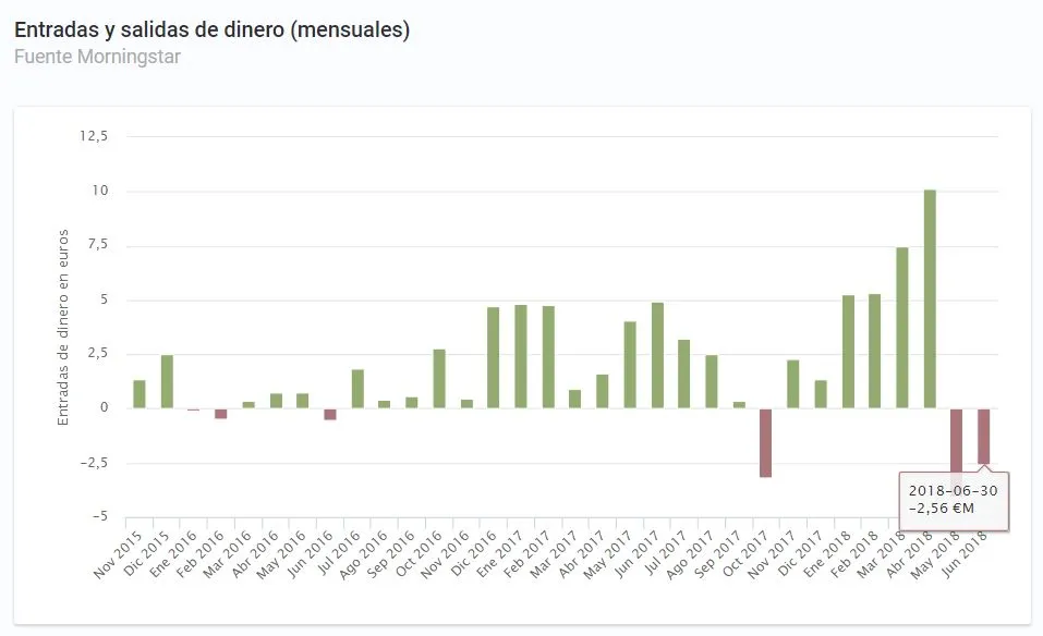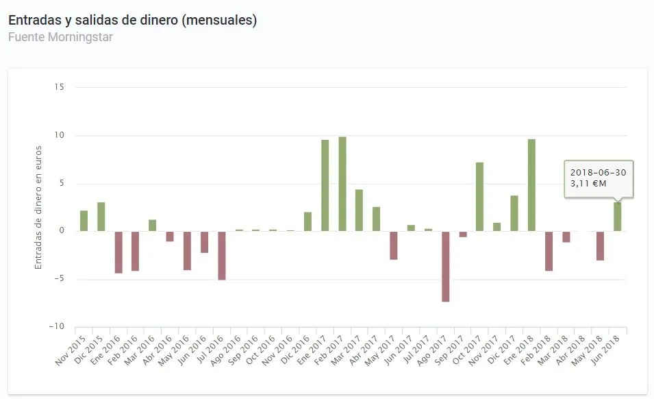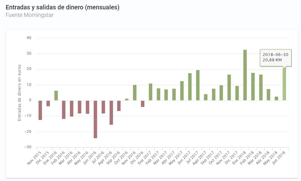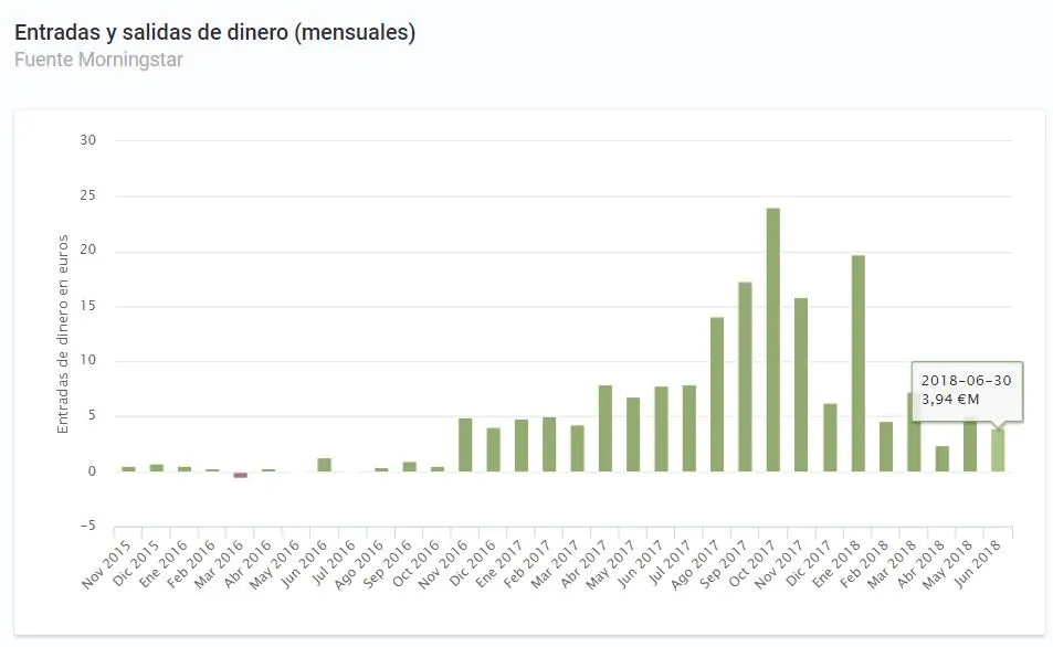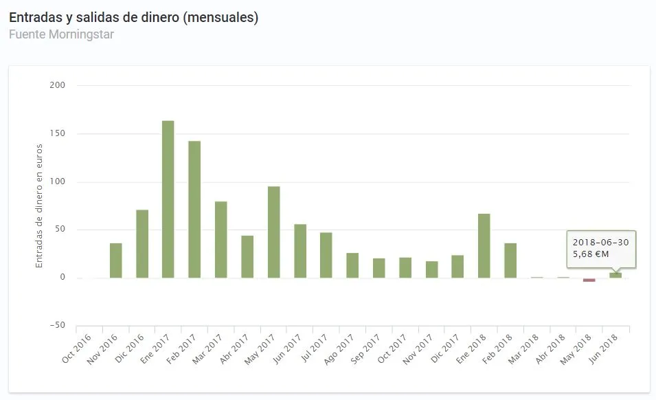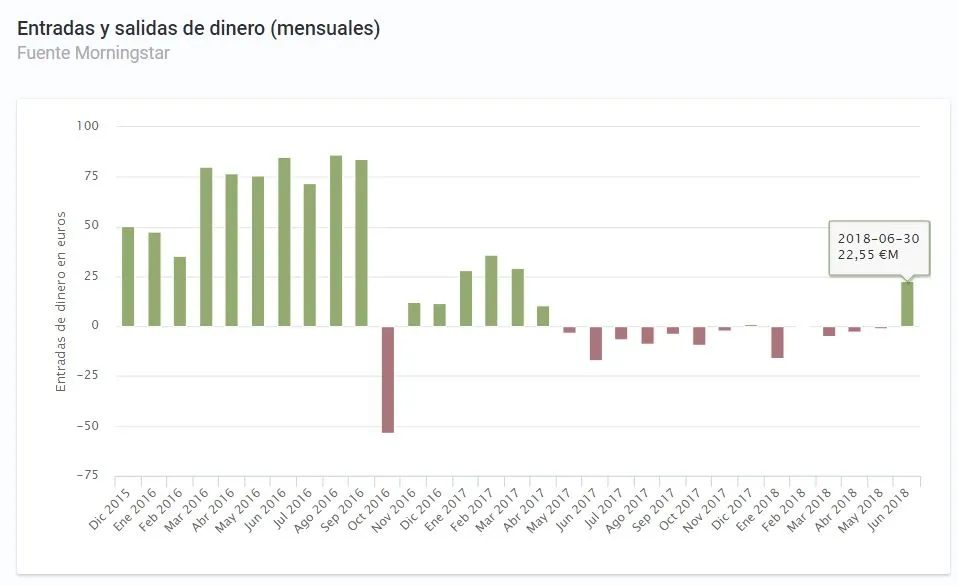 Tras una racha continuada de salidas de dinero del fondo internacional gestionado por Álvaro Guzmán y Fernando Bernad se producen entradas de dinero por valor de 22,55 millones de euros estas cifras no se registraban desde el pasado marzo de 2017. A pesar de ello a cierre del semestre la balanza sigue pesando más del lado de las salidas.