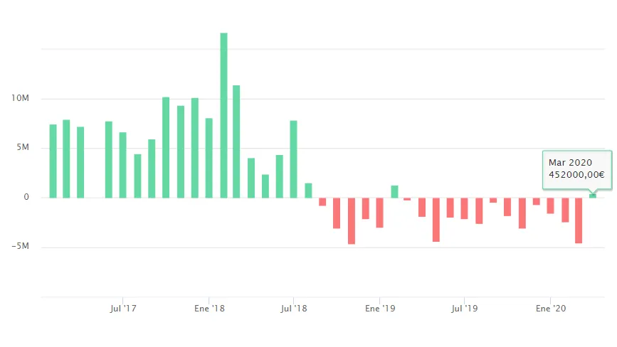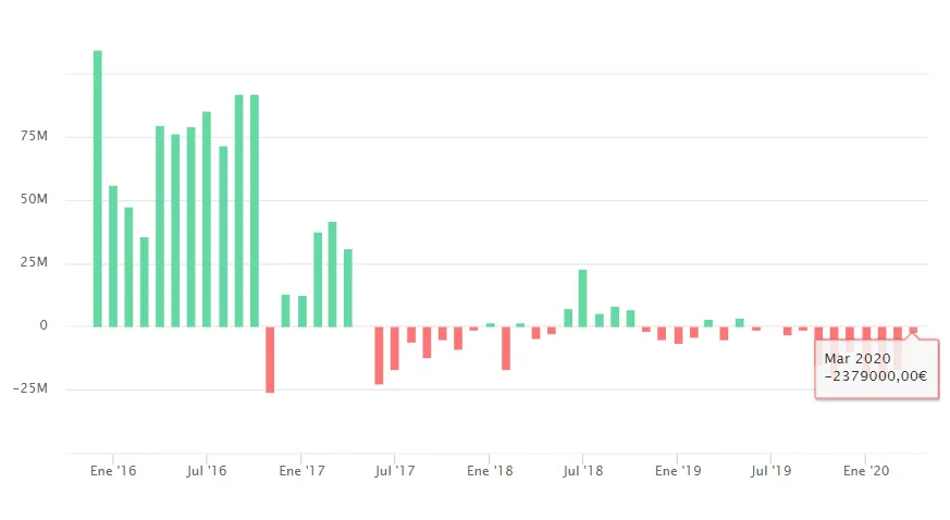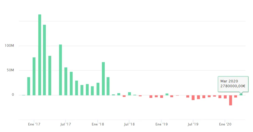 Algo muy distinto ha ocurrido en los fondos de Cobas, dónde hay inversores que han aprovechado las caídas de más del 40% desde enero para tomar posiciones. Así podemos observar en el gráfico, las entradas que se han producido durante el mes de marzo en Cobas Selección, cercanas a los 3 millones de euros. A estas hay que añadir las entradas en su homólogo, Cobas Internacional, que superan los 4 millones de euros o en Cobas Renta de 1,9 milllones de euros. No podemos decir lo mismo de Cobas Iberia del que salen 1,3 millones de euros en marzo.