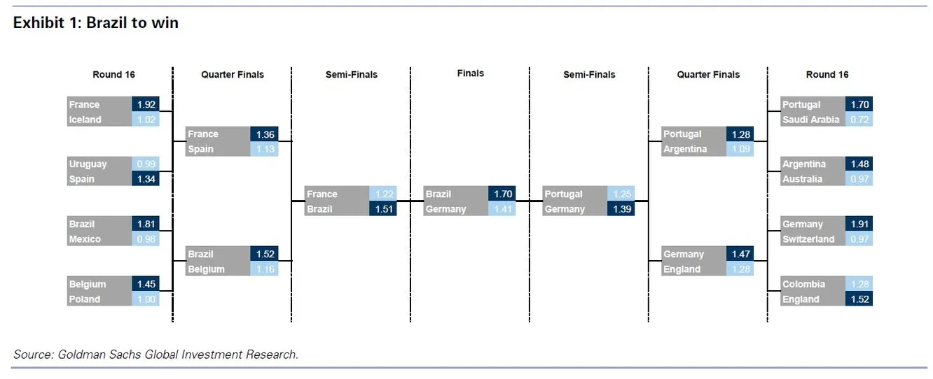 A modo de curiosidad, os dejo por aquí las estadísticas en las que la Goldman Sachs apuesta por Brasil como ganador de la Copa del Mundo 2018, en base a datos históricos.