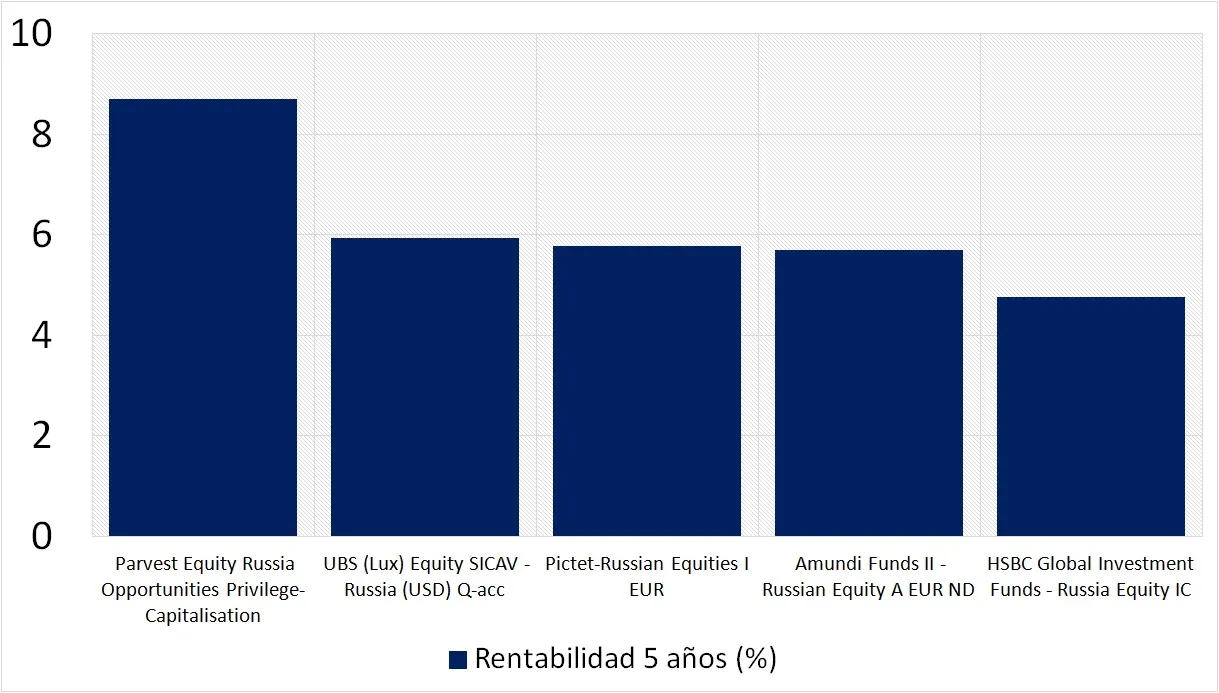 A continuación se muestran los cinco fondos de inversión con exposición a Rusia más rentables durante los últimos 5 años: