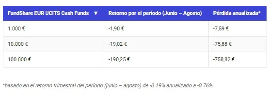 Hasta ahora, esto no era un problema para el cliente de DeGiro, porque la entidad asumía esas pérdidas y no se las pasaba al inversor. Pero el broker ha venido comunicando a los clientes durante las últimas semanas que dejará de hacerlo a partir de mañana, 15 de septiembre. Es decir, que a partir de ahora, sí sufrirán esos tipos negativos. ¿Cuál será el impacto? Este es el análisis que han hecho desde DeGiro según la cantidad en cuenta.