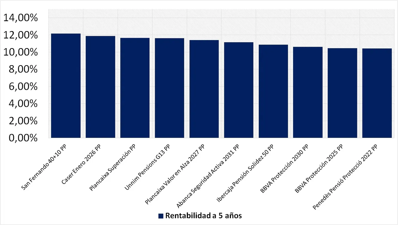 ¿Qué ocurre cuando ampliamos el horizonte temporal? A cinco años podemos observar como tan solo Caser Enero 2026 PP y San Fernando 40+10 PP se encuentran dentro de los planes de pensiones más rentables en el corto y el largo plazo. Además encontramos otros planes de pensiones como BBVA Protección 2030 y 2025 que alcanzan rentabilidades superiores al 10% en el largo plazo.