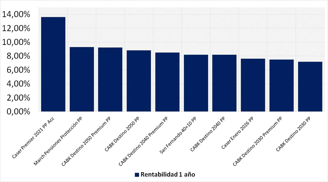 Además la mayoría de los planes de pensiones que se sitúan dentro del top 10 más rentable a un año pertenecen a Caixabank. De esta manera CABK Destino 2050 Premium PP, CABK Destino 2050 PP, CABK Destino 2040 Premium PP y CABK Destino 2040 PP obtienen rentabilidades superiores al 8% a un año.