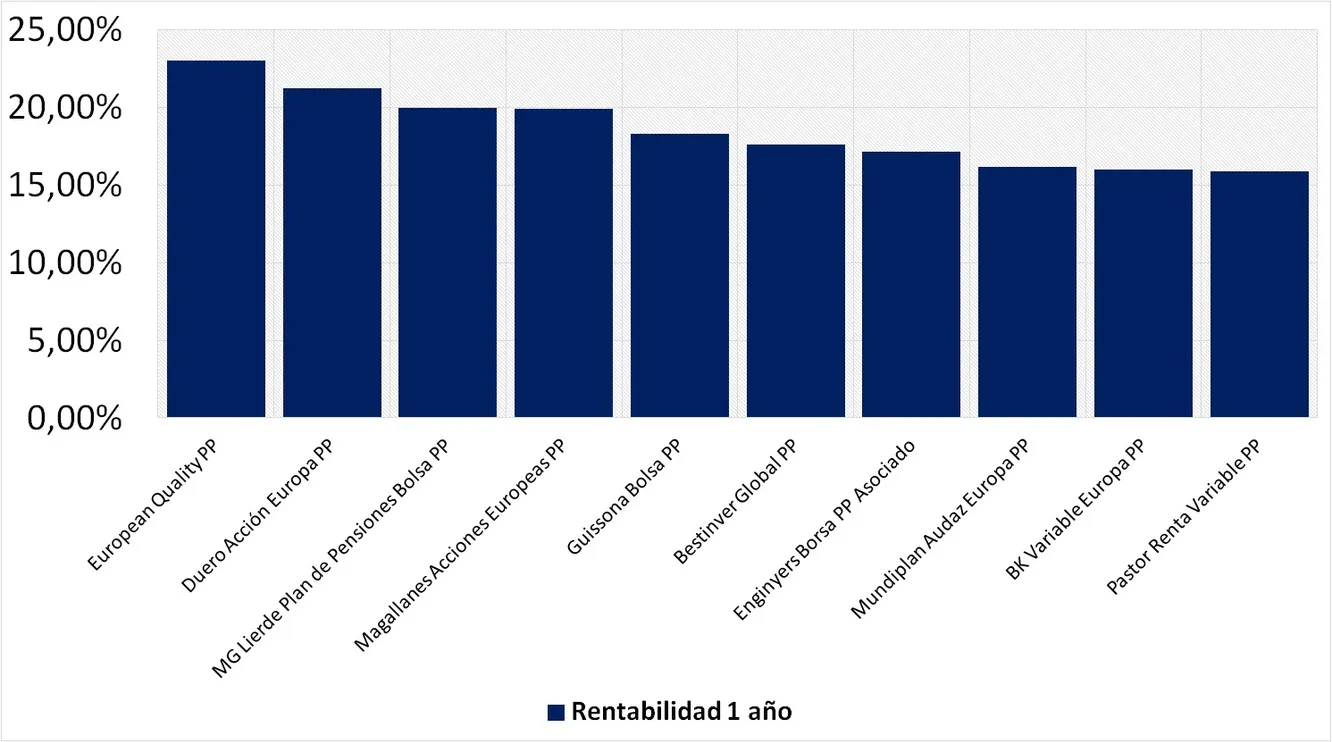 Entre los planes de pensiones de Renta Variable Europa más rentables a un año encontramos algunos conocidos como European Quality de @Abante o Magallanes Acciones Europeas de @MagallanesValue que alcanzan un 23% y 19,91% respectivamente.