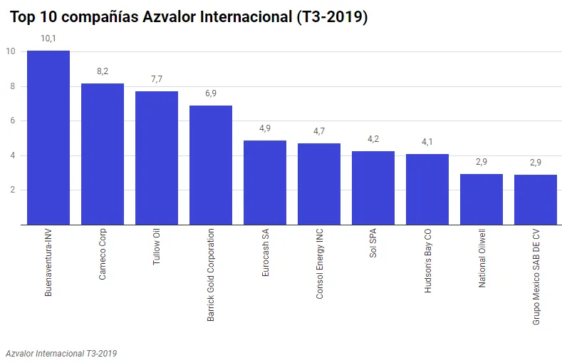 La cartera internacional de Azvalor está compuesta por un total de 54 valores, las 10 principales posiciones representan un 56,55% de la misma. En lo que se refiere a exposición es conocida ya de sobra la especialización de la firma a compañías relacionadas con las materias primas durante los últimos años. Entre ellas la mayor posición en cartera es la compañía productora de metales preciosos más grande de Perú, Buenaventura. En este sentido podemos encontrar otras compañías mineras en el top 10 como Cameco (segundo mayor productor de uranio del mundo), Barrick Gold (la minera de oro más grande del mundo), Consol Energy o Grupo Mexico.