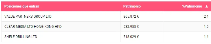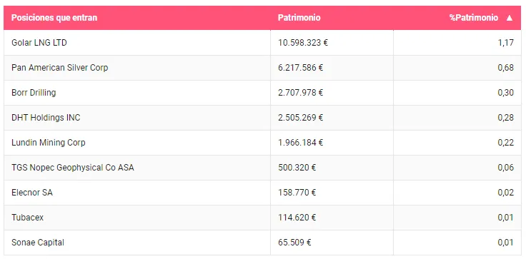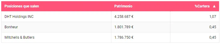 Entre las posiciones que salen de cartera, la firma se desprende de tres valores. La compañía petrolera DHT Holding es la que representaba un mayor peso, además de dos posiciones en la que mantenían un peso residual, Bonheur y Mitchells & Butlers. A todo ello, hay que hay que añadir la venta parcial de Euronav.