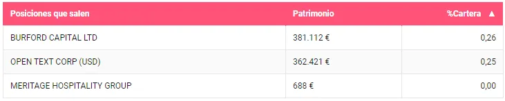 Tres han sido las posiciones que han salido de cartera. En todas ellas el peso que mantenían era residual. De esta manera la que representaba un mayor peso era Burford Capital, recientemente la compañía protagonizaba un desplome de más del 60% en bolsa tras conocerse la manipulación en algunos de sus indicadores financieros. En segundo lugar tenemos a la compañía de software más grande de Canadá, Open Text Corp y por último Meritage Hospitality, posición que llevan deshaciendo desde el último trimestre del año.