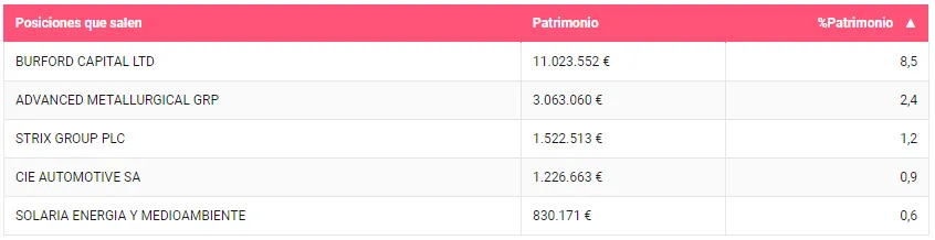 En lo que se refiere a las salidas, cinco han abandonado la cartera este trimestre. Con especial peso la salida de Burford capital que ya comentamos aquí, también es destacable la salida de Advanced Metallurgical en la que mantenían un peso del 2,4%.