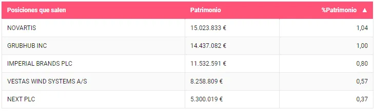 Entre las principales posiciones que salen de cartera encontramos Novartis, la multinacional dedicada a la industria farmacéutica y biotecnológica. En segundo lugar por tamaño en cartera, el mercado estadounidense de pedidos y entregas a domicilio, Grubhub. Además deshacen su posición en la cuarta mayor compañía tabaquera del mundo, Imperial Brands, materializando pérdidas.