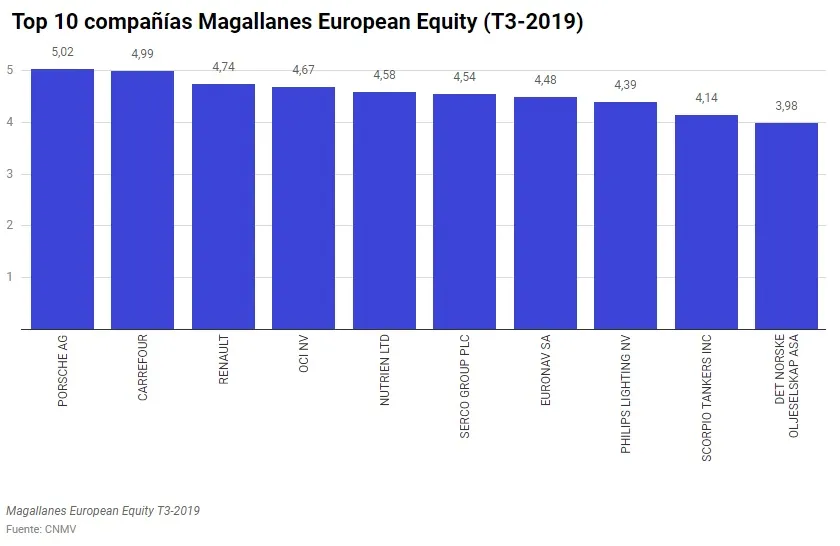 Dentro del top 10 podemos observar un sesgo hacia compañías automovilísticas, siendo Porsche y Renault dos de los valores con mayor peso en cartera. También hacia valores relacionados con el transporte de petróleo por mar, como Euronav o Scorpio Tankers.