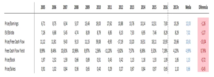 Para el año actual (2017e), con la intención de ser más conservadores e incrementar el margen de seguridad, los ratios se han calculado manteniendo las cifras de venta, EBITDA, FCF... con el mismo valor que mostraban en 2016 pero calculando el precio con la cotización actual (7,13 por acción mientras se escriben estas líneas).