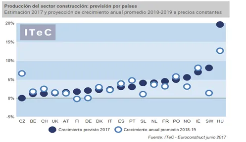 El sector en Europa: antes de entrar en más detalle con los fundamentales del sector es necesario recordar que la industria de la construcción es un sector muy cíclico y está altamente expuesto a los cambios que se producen en la economía. Dicho esto, y a pesar de la incertidumbre política que aún se resiste a desaparecer en algunas partes de Europa, estamos asistiendo a una clara mejora de los fundamentos económicos que perfila un horizonte tranquilo para la economía europea. En este momento ya se ha superado el nivel de empleo que se registró en 2008 en Europa lo que fortalece la demanda interna de la mayoría de los países, mientras que los bajos costes de financiación están contribuyendo a acelerar la inversión. Estas variables repercuten positivamente en el sector de la construcción el cual se espera crezca un 2,9% en 2017 después de aumentar un 2,5% en 2016 (datos de Euroconstruct). En la siguiente imagen se puede observar la previsión de la producción del sector de la construcción por países: