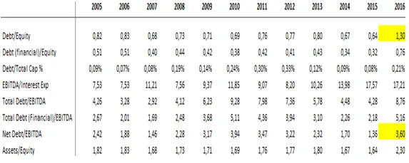 Como se puede observar en la imagen superior durante los últimos 12 años (destacar que este periodo de tiempo incluye un ciclo económico completo con una gran crisis económica como fue la de 2008) la compañía ha mantenido un control riguroso de su deuda no superando en ningún momento, con la excepción de este último año (después veremos el motivo), la deuda el patrimonio neto de la compañía. Además podemos ver como la deuda neta siempre está controlada en torno a dos veces EBITDA salvo en 2 ocasiones 2010 y 2016 donde llega a estar en 3,94x y 3,60x lo que para un sector tan intensivo en capital no está nada mal. Cabe señalar que es su plan de negocio tienen el objetivo de reducirla a 1,4x deuda neta/EBITDA en 2019.