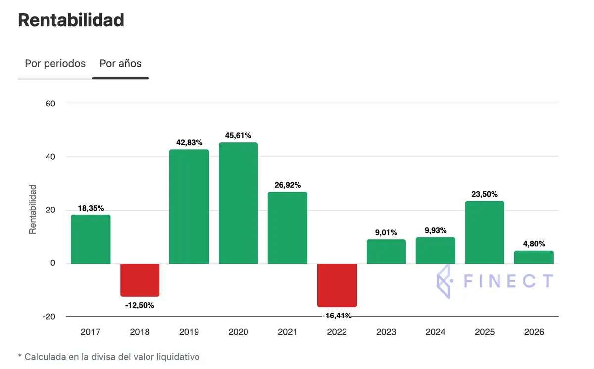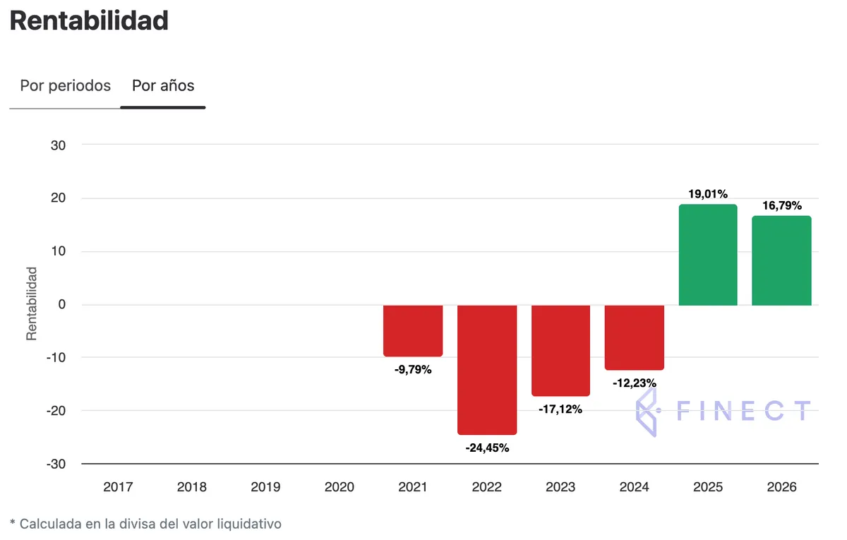 Este fondo de inversión, gestionado por Renta 4 Gestora, acumula una rentabilidad del 16,79% en lo que va de ejercicio, según datos a 16 de enero. Con un indicador de riesgo de 5/7, su rentabilidad anualizada a cinco años es de -11,13%. El pasado ejercicio fue su primer año de rentabilidad positiva tras cuatro años a la baja, con una rentabilidad del 19,01%.