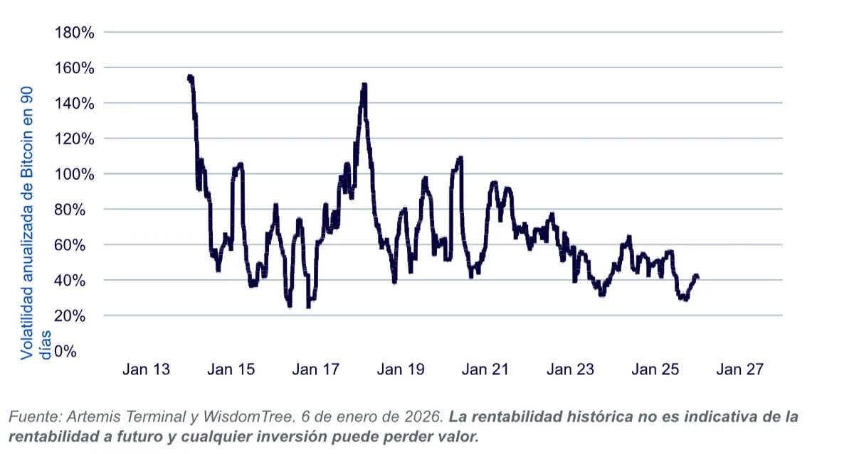 "El perfil de volatilidad del bitcoin está evolucionando. Aunque sigue siendo elevada en relación con las clases de activos tradicionales, la volatilidad real se ha reducido considerablemente en comparación con ciclos anteriores. Esta es una condición necesaria para que el bitcoin funcione como una asignación estratégica y no como un instrumento de negociación a corto plazo", ha aseverado la experta.