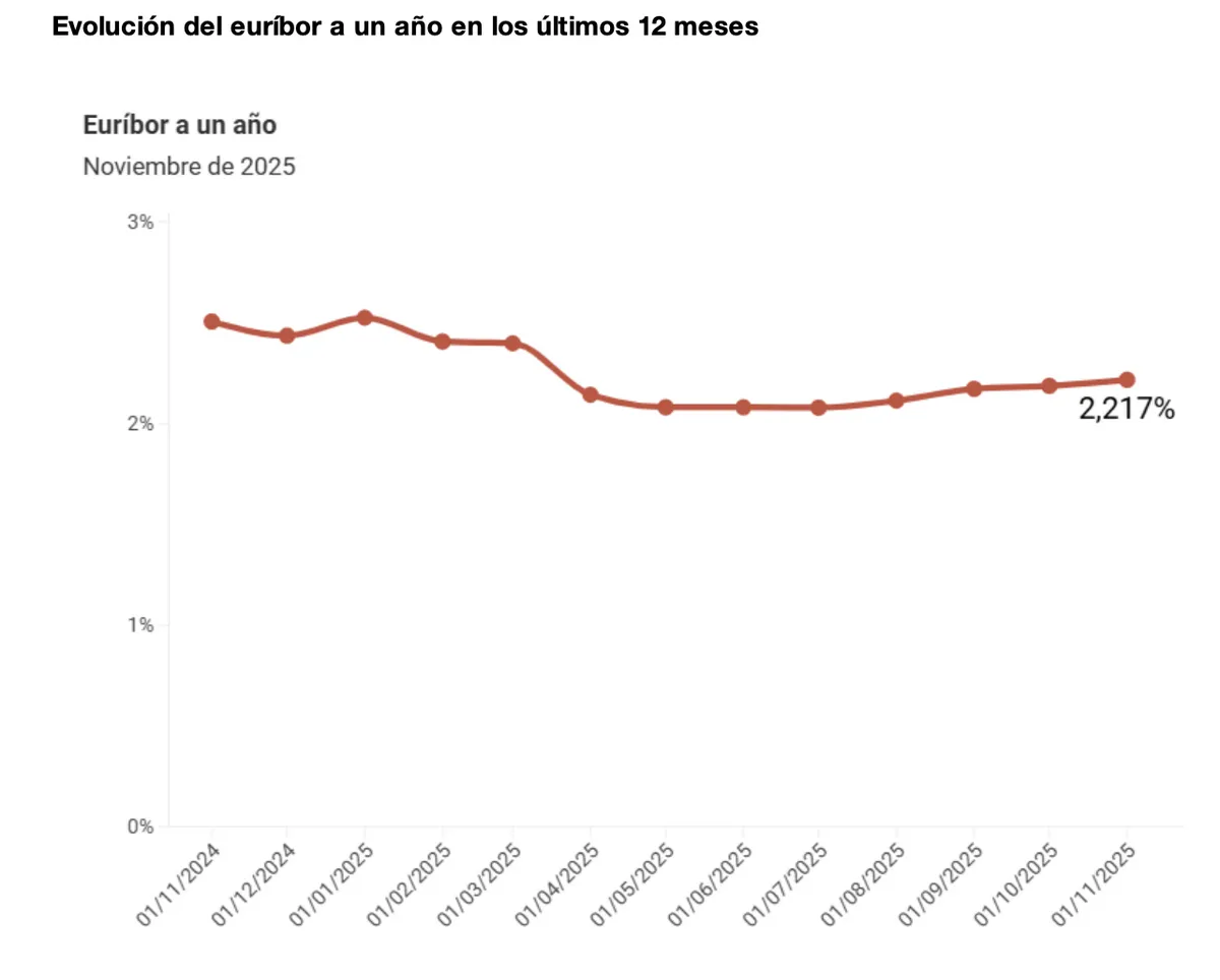 El índice euríbor a 12 meses, que sirve de referencia para las hipotecas a tipo variable en España, ha subido en el mes de noviembre hasta situarse en el 2,217%, según ha comunicado este lunes el Banco de España. Esto supone un ligero incremento con respecto al pasado mes de octubre, cuando se situó en el 2,187%.