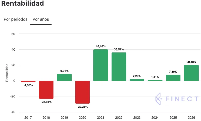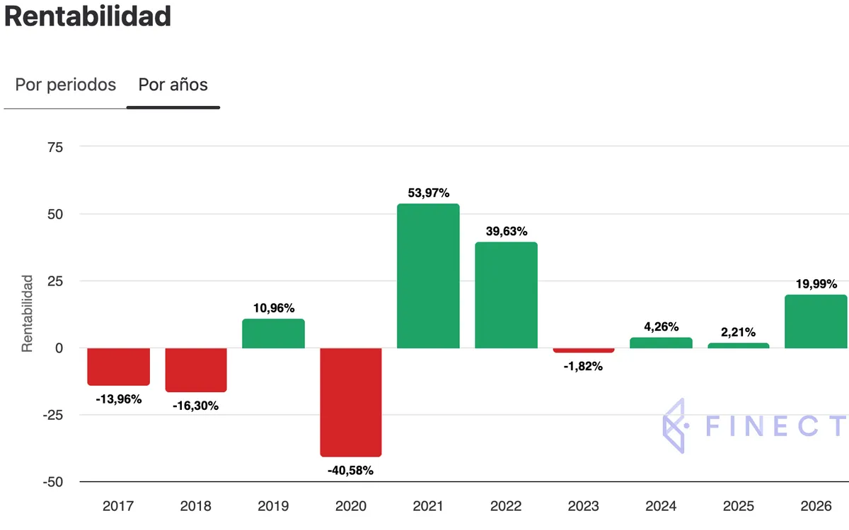 Tras un rendimiento negativo en el año 2023, el fondo se recuperó y ha rendido en positivo los dos últimos años. Su rentabilidad actual supone la más alta desde el año 2022. Este vehículo de inversión tiene una comisión de gestión del 1,99%, con unos gastos corrientes del 1,77%.