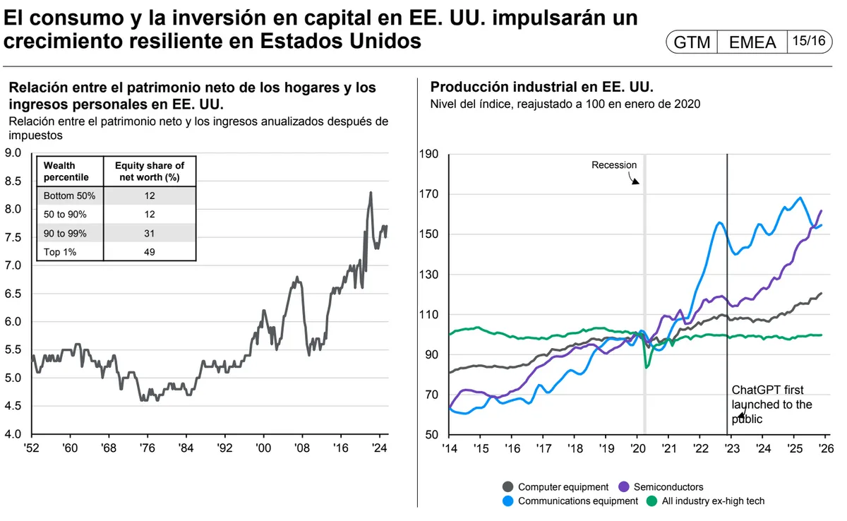 Por otro lado, están las compañías, que aguantaron los aranceles tras sorprender "positivamente" el pasado ejercicio. Este hecho ha evidenciado, según la experta, lo “dinámica” que es la economía americana. En un entorno difícil para el consumidor, la inversión en capex de las compañías fue uno de los grandes motores de crecimiento, en especial, la inversión en tecnología. Por ello, la economía estadounidense debería seguir creciendo, según ha previsto JPMorgan AM.