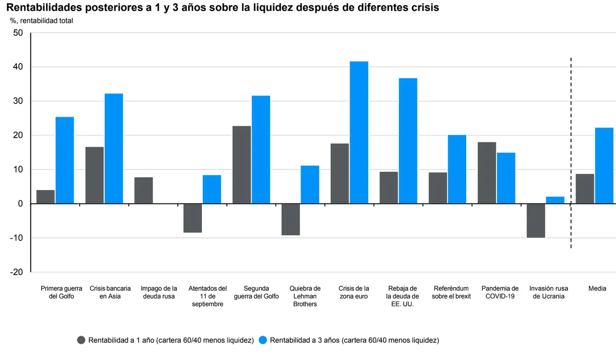 El equipo de JPMorgan AM ha comparado una cartera multiactivo 60/40, es decir, que invierte un 60% en renta variable (acciones) y el 40% restante en renta fija (bonos), frente a la liquidez. Tras este análisis, la experta ha observado que, pese a ofrecer la liquidez una mayor rentabilidad el primer año, en un horizonte a tres años “siempre lo hace mejor la cartera mixta”.