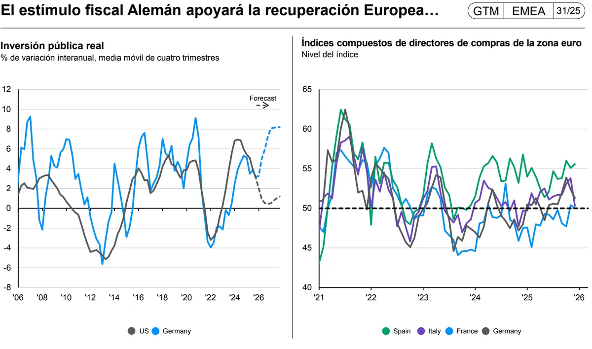 También ha destacado el aguante de las regiones del sur, como Italia o España. Por otro lado, unos tipos de interés más bajos, que actualmente se encuentran en el 2%, ayudarán al consumo. La experta ha recalcado que éste ha estado "parado en los últimos años", lo que ha impactado en el crecimiento. En consecuencia, ha situado el crecimiento del Viejo Continente para 2026 por encima de lo rendido en el pasado ejercicio.