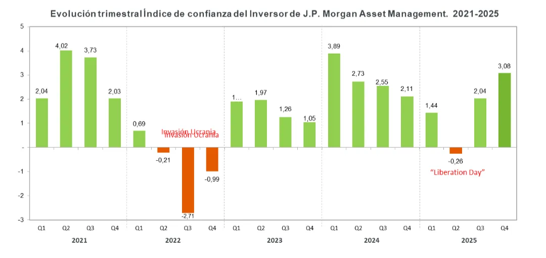 El Índice de Confianza del Inversor Español, elaborado por JPMorgan Asset Management, refleja el aumento en la confianza del inversor español en los mercados financieros a finales de 2025. Los inversores encuestados han mostrado un mayor optimismo de cara al 2026 pese a las tensiones geopolíticas y el ruido de la existencia de una burbuja dentro de la tecnología.