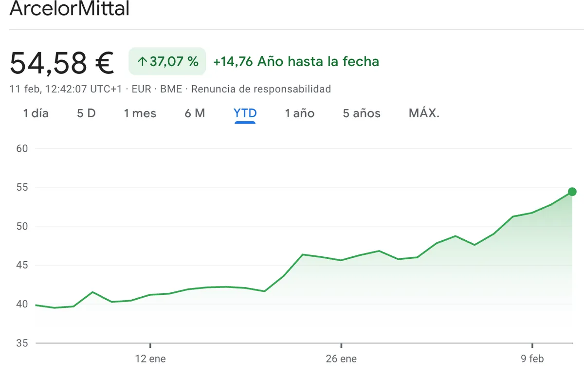 ¿A cuánto cotizan las acciones de la empresa este miércoles? Los títulos de la firma cotizan a un precio de 54,58 euros este miércoles 11 de febrero a las 12:42 horas, según datos de Google Finance. Las acciones han experimentado una subida del 37,07% en lo que va de 2026.