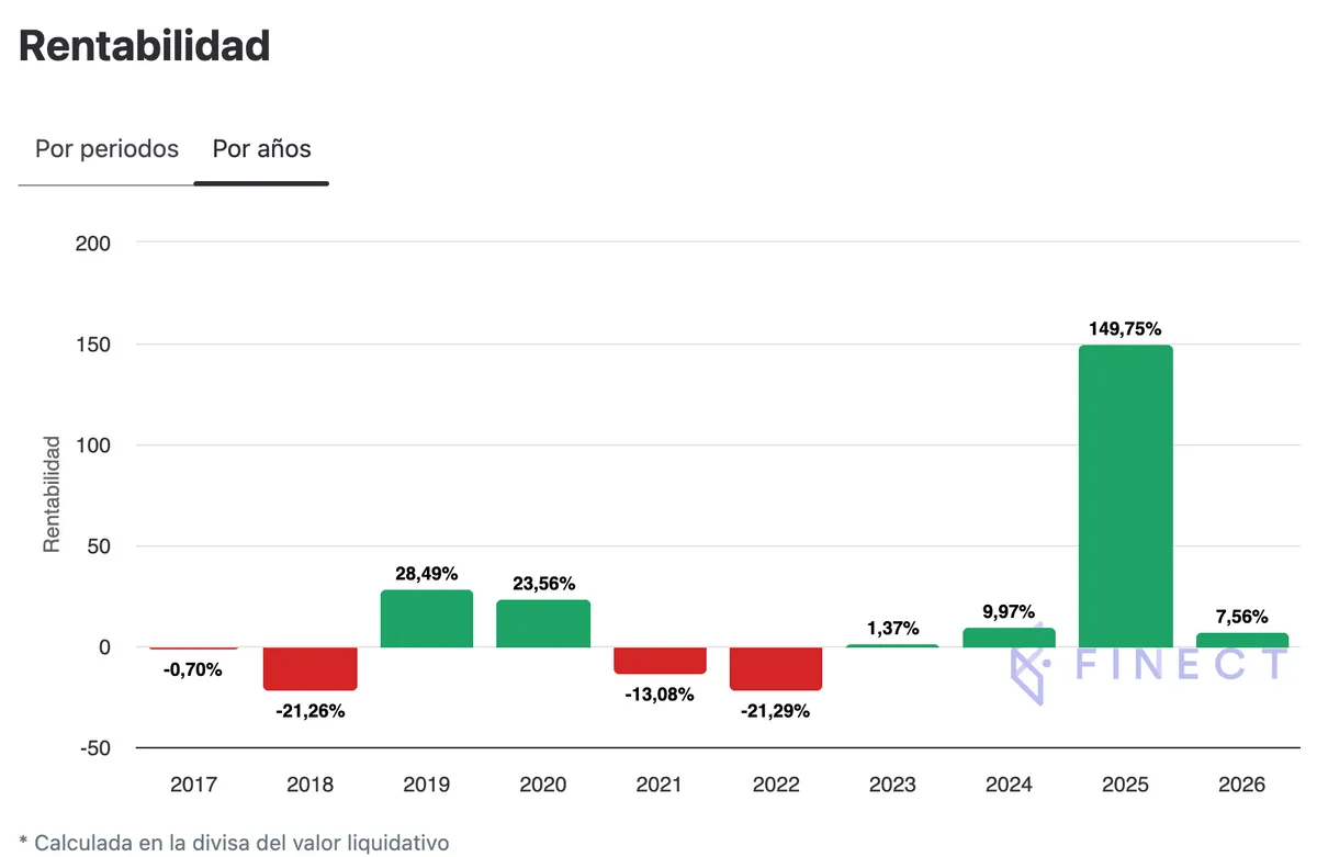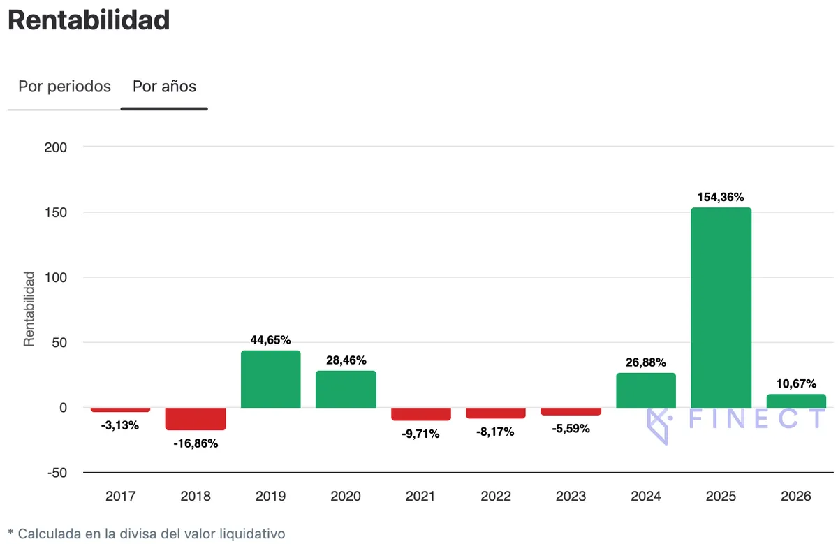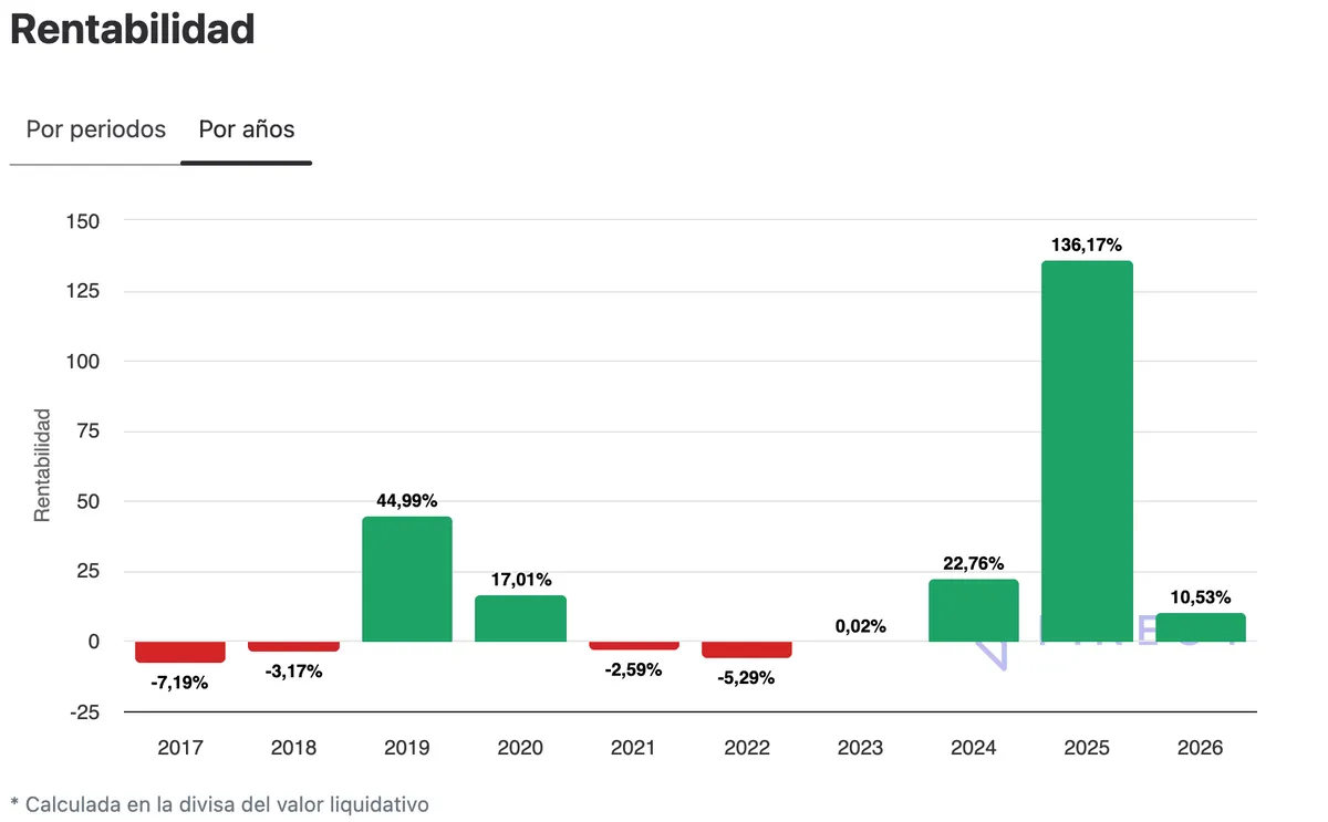 Este vehículo de inversión de Jupiter Asset Management ha sido también uno de los más vistos de su categoría. En lo que va de 2026, ha logrado una rentabilidad del 10,67%, con una rentabilidad anualizada en un horizonte temporal a cinco años del 23,75%, según datos a 5 de febrero. Con un indicador de riesgo 7/7, el fondo conlleva una comisión de gestión del 1,5%, con unos gastos corrientes del 1,75%.