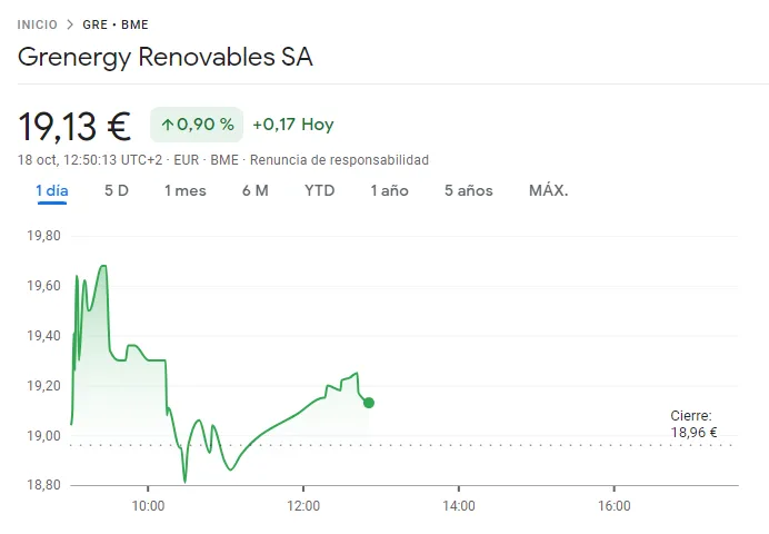 A raíz de esta operación, Grenenergy ha llegado a subir hasta un 3,8% en Bolsa en los primeros compases de la sesión. Las subidas se han moderado posteriormente hasta situarse en el 0,90% y el precio de las acciones se ha colado en los 19,13 euros cerca de las 13 horas, según Google Finance.