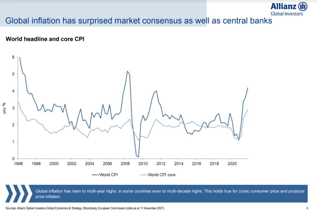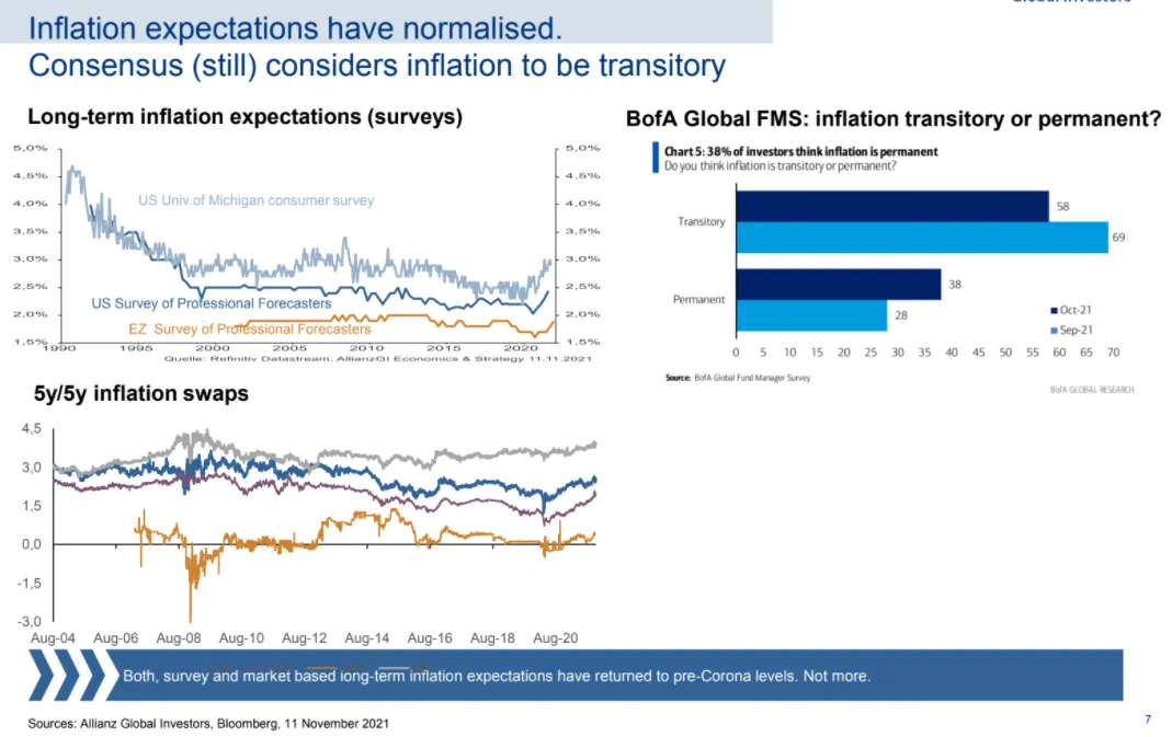 Ante la discusión sobre si la inflación va a ser transitoria o permanente, el responsable de Allianz ha enseñado una encuesta de Bank of America donde seis de cada 10 inversores creen que es transitoria. “Hay una mayoría de inversores que piensan que la inflación es transitoria. Sin embargo, el porcentaje es menor que el mes anterior. El sentimiento ha cambiado”, ha apuntado.