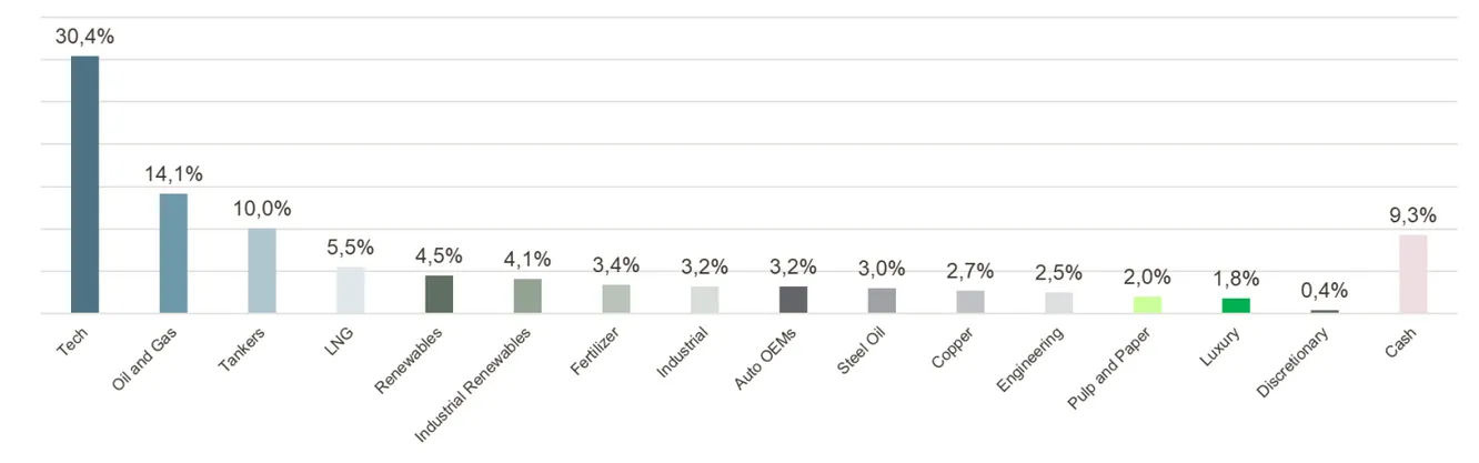 Actualmente, el sector tecnológico acumula la mayor exposición del fondo (30,4%), seguido de las empresas dedicadas al petróleo y el gas (14,1%). Sin embargo, no tiene exposición al sector bancario.