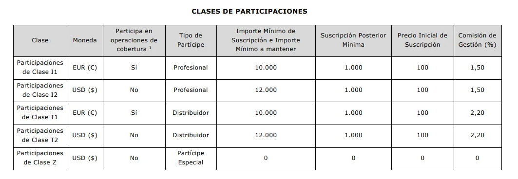 Este vehículo de inversión requiere una inversión mínima inicial de 10.000 euros. La sociedad gestora comercializa este fondo en cinco clases distintas, en función del tipo de inversor: