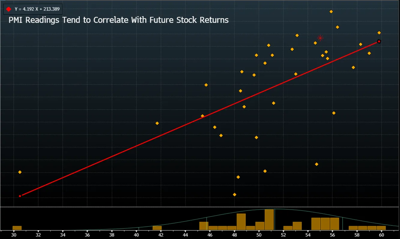 Este el gráfico de Bloomberg sobre esta correlación entre el PMI y la cotización de las acciones:
