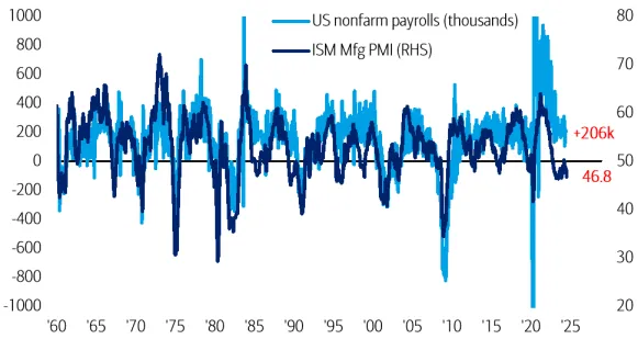 El equipo de BofA cree que los riesgos de que se produzca un aterrizaje duro de la economía de EEUU están aumentando. Además, advierte de que una señal de advertencia de que se avecina un aterrizaje duro de la economía es la estrecha correlación entre las nóminas no agrícolas y el PMI manufacturero del Instituto de Gestión de Suministros (ISM). Este índice recoge la demanda de productos en el país norteamericano midiendo la cantidad de pedidos que realizan las fábricas.