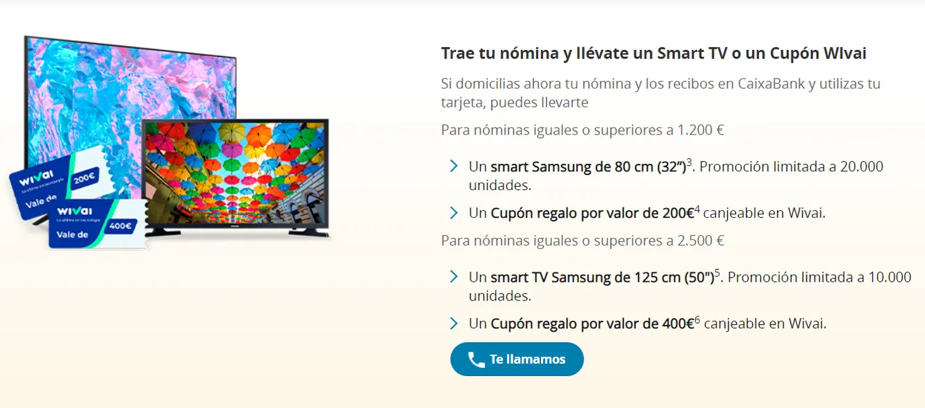 Los bancos continúan con su particular batalla por captar clientes procedentes de otras entidades. Caixabank ha lanzado este mes una promoción que asegurarse la vinculación. A cambio de domiciliar una nómina en la Cuenta nómina sin comisiones del banco, el usuario puede conseguir una televisión o un cupón regalo para utilizar en su plataforma de venta de productos tecnológicos Wivai.