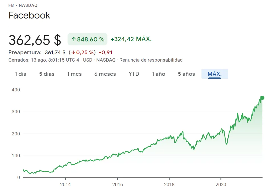 El rally de Facebook en los mercados financieros ha sido imparable, a pesar de sufrir algunos baches. El precio de la acción de Facebook ha subido desde los 42 dólares iniciales de su salida a Bolsa en 2012 hasta superar actualmente los 360 dólares.