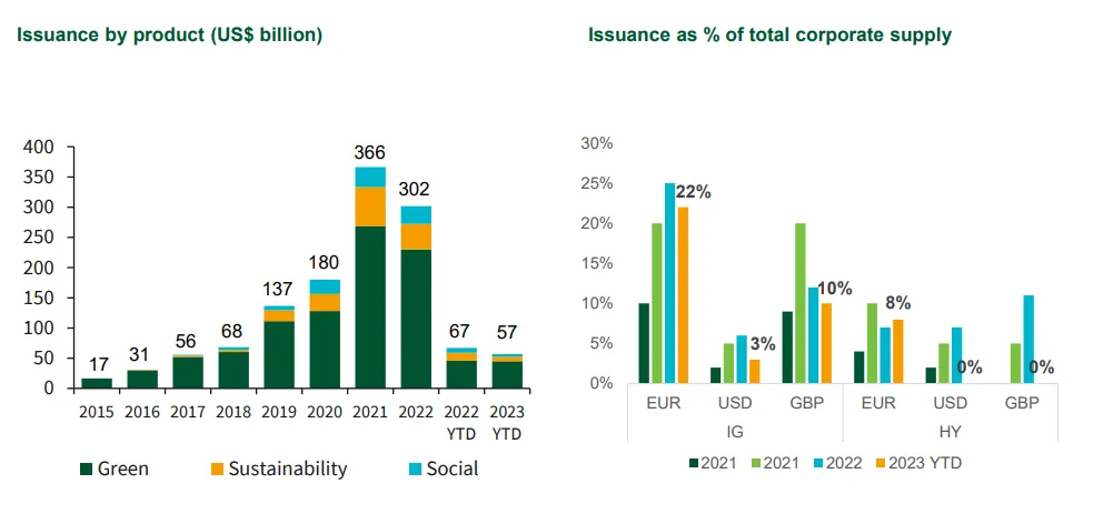El auge de los bonos de impacto reside sobre todo en Europa, ya que la Unión Europea ha adquirido un papel de liderazgo en la lucha contra el cambio climático. El 22% de las nuevas emisiones realizadas por compañías europeas en grado de inversión en lo que va de 2023 han sido bonos de impacto.
