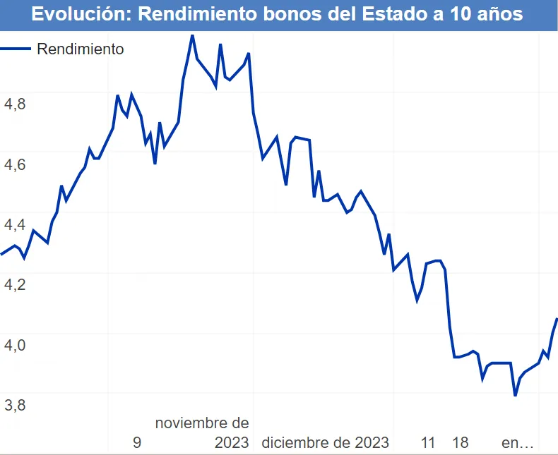 El rendimiento de los bonos del Tesoro de Estados Unidos a 10 años recuperó la semana pasada el nivel del 4%. En concreto, el interés del T-Note se situó en el 4,05% en la jornada del viernes, según recoge el portal Datos Macro del periódico Expansión.