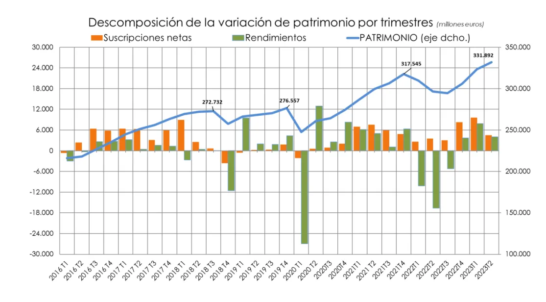Gracias a este aumento, el patrimonio de los fondos de inversión ha alcanzado un nuevo máximo histórico al situarse en 331.892 millones de euros. A lo largo del año, se ha incrementado en 25.700 millones de euros durante el primer semestre.