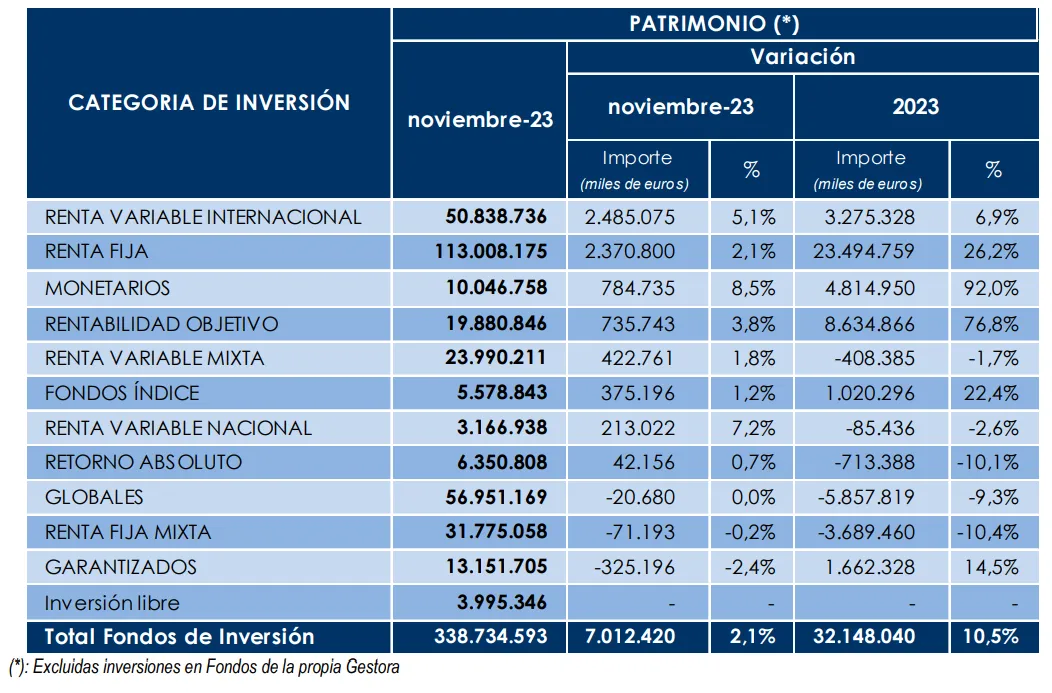Gracias a este incremento, el patrimonio total de los fondos en España se ha situado en 339.000 millones de euros en noviembre. Esta cifra supone un ascenso del 2,2% respecto al mes pasado y, sobre todo, implica un cambio de rumbo respecto a las pérdidas patrimoniales registradas entre agosto y octubre.