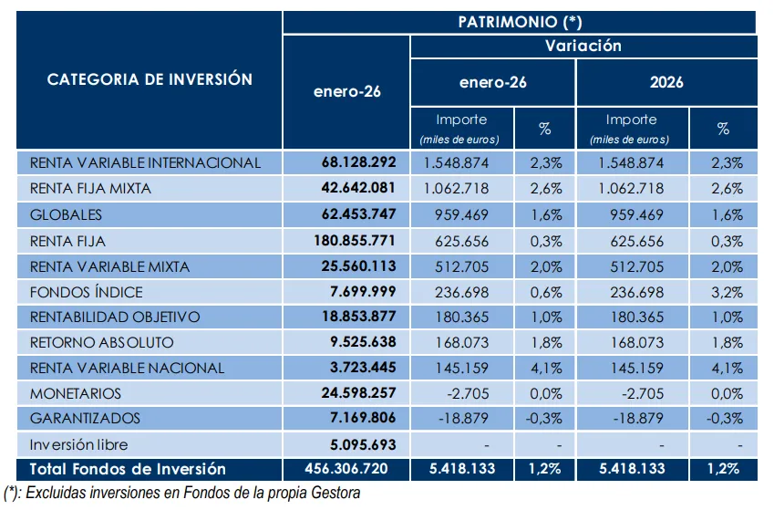 Así ha evolucionado el patrimonio de las diferentes categorías de fondos de inversión españoles en el mes de enero de 2026: