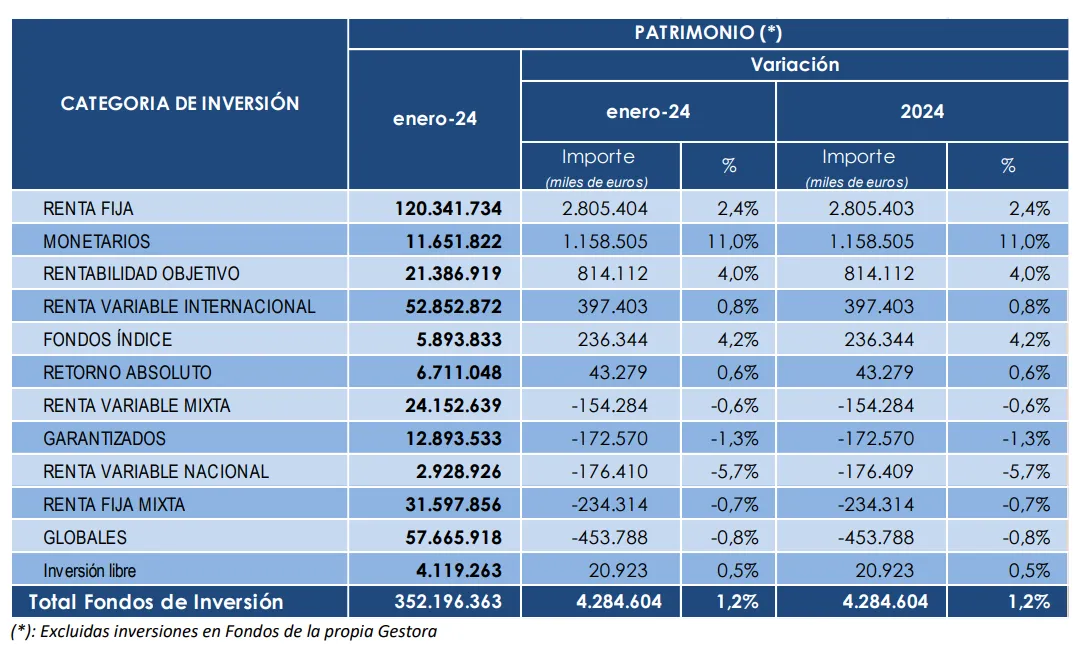 El patrimonio de los fondos de inversión en España aumentó de nuevo en el mes de enero de 2024. El volumen de activos de estos vehículos de inversión se incrementó en 4.285 millones de euros durante el mes pasado, según los datos definitivos publicados este lunes por la Asociación de Instituciones de Inversión Colectiva y Fondos de Pensiones (Inverco).