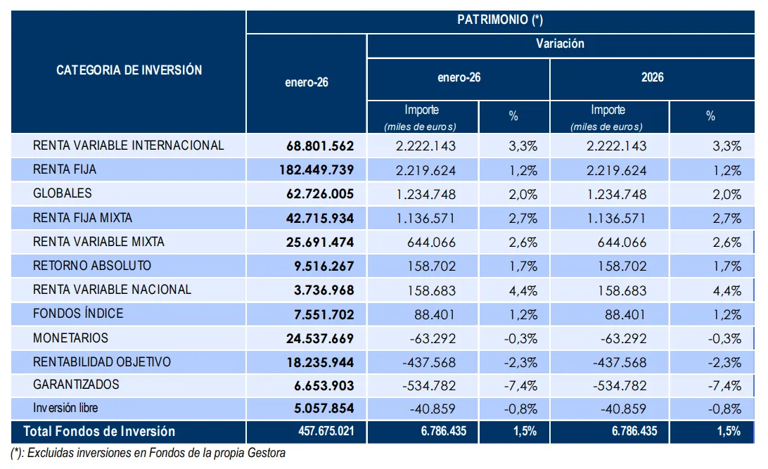 Así ha evolucionado el patrimonio de las diferentes categorías de fondos de inversión españoles en el mes de enero de 2026: