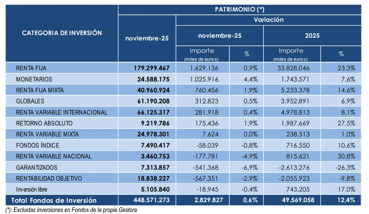 Así ha evolucionado el patrimonio de las diferentes categorías de fondos de inversión españoles en el mes de noviembre y entre enero y noviembre de 2025:
