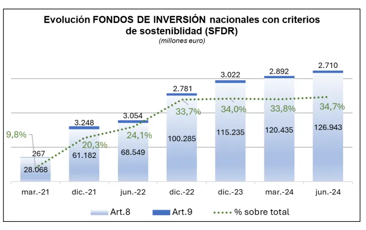 A raíz de la entrada en vigor del reglamento europeo SFDR en marzo de 2021, el patrimonio registrado en fondos sostenibles ha experimentado un crecimiento de 101.318 millones. Estos vehículos de inversión sostenibles han pasado de representar el 9,8% de marzo de 2021 hasta supone un 34,7% a finales de junio de 2024.
