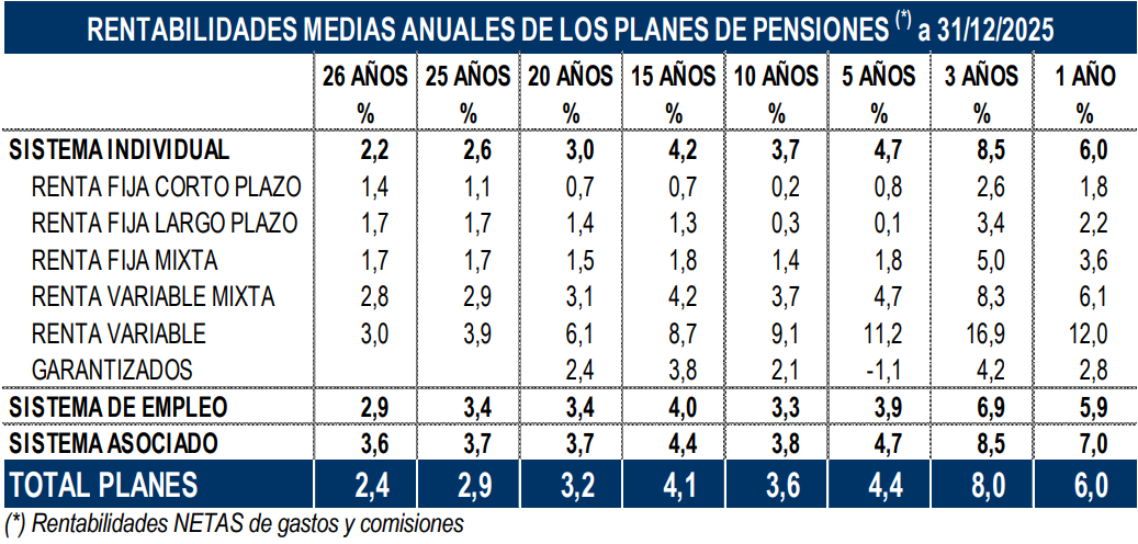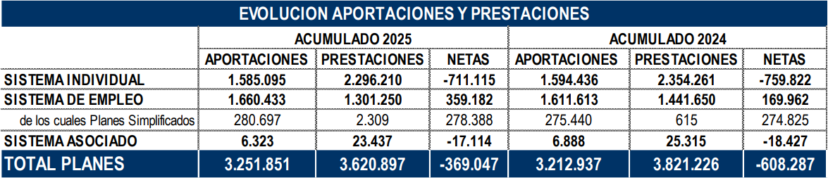 En cambio, el balance fue más positivo en los planes de empleo, donde las aportaciones sí superaron a las prestaciones. "En el sistema de empleo, las aportaciones se incrementaron muy ligeramente hasta los 1.660 millones (49 millones más que en 2024), que unido a la reducción de las prestaciones, permitieron al sistema de empleo cerrar 2025 con aportaciones netas positivas por segundo año consecutivo (359 millones)", han afirmado.