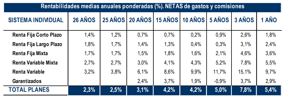Estos productos de ahorro para la jubilación registraron una rentabilidad interanual del 5,4%. Las categorías con mejores comportamientos fueron la renta variable, con una revalorización del 9,7% respecto al año anterior.