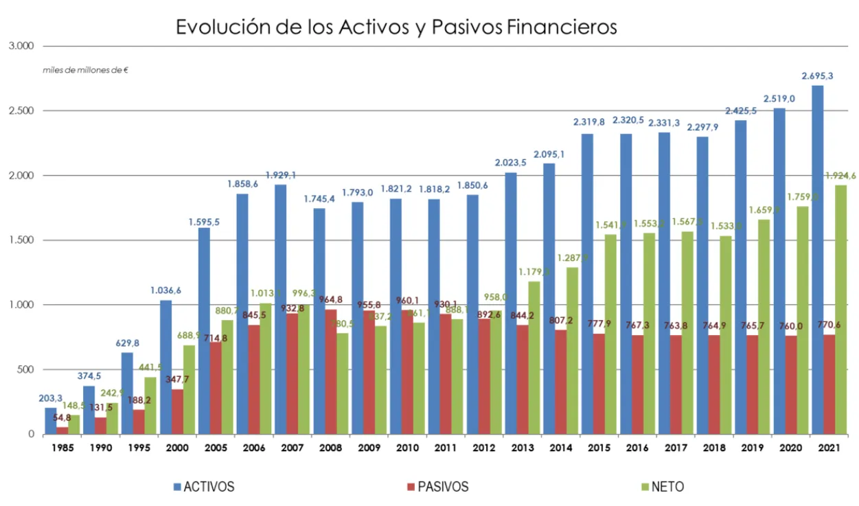 El ahorro financiero de las familias españolas ascendió hasta los 2,69 billones de euros a cierre de 2021, según los datos de las cuentas financieras de la economía española del Banco de España. Los hogares españoles tenían a finales del año pasado unos 176.000 millones de euros más invertidos en activos financieros que en diciembre de 2020, un incremento del 7%.